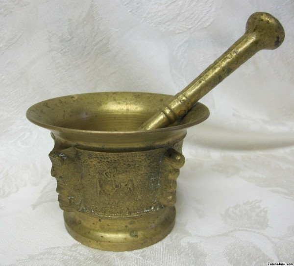 Brass Mortar and Pestle with anchor and woman face (photos are same item found on ebay)