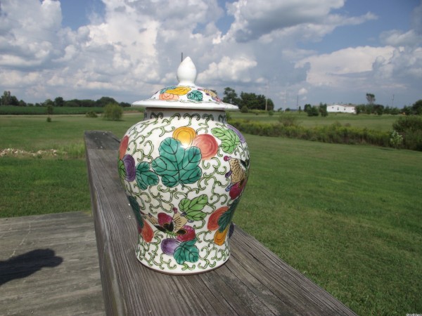not sure how old this is but the stamp on the bottom looks like it is from the great qing dynasty,it measures 8 1/2 inches tall and 5 inches wide it has a hand painting of butterflies and flowers and is chip and crack free if anyone could tell me an age and value i would appreciate it contact me at d_shiflett@yahoo.com