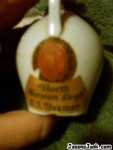 Small jar, looks like a little jug. Has red wax seal on top with the words "originalabfollung a. riemerschmid". Has a copper/orange bow around neck of bottle. Red, blue, and yellow flowers painted on it. Circle emblem of a man with the date 1835 and some illedhible words around it. Another paper seal on it that says "North German Lloyd S.S. Bremen". The man figure is imprinted on the bottom of the jar as well as a word and the numbers 1500 in reverse. There is some sort of liquid inside the jug.