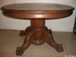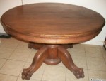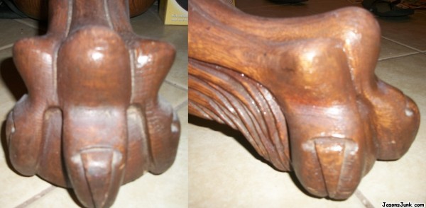 Table is dark wood. 2 1/2 feet tall and 4 feet across. It has 4 huge claw feet that are 6 inches across at widest and 5 inches tall. The base is about 10 inches across and almost 3 feet around. The paws stick out about 16 inches from the round base. The top photos make the top of the table a little rounded looking and it is not