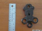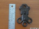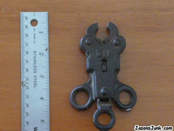 The center ring of the three rings is spring loaded and when pulled it will release/open the top clasp. Each cast iron part has a casting number. The main body is #106. The top plate is #112. The center pull ring is probably #198. It looks like it was used for clamping onto a cable, rope or rod with perhaps a rope threaded through the two outer rings.