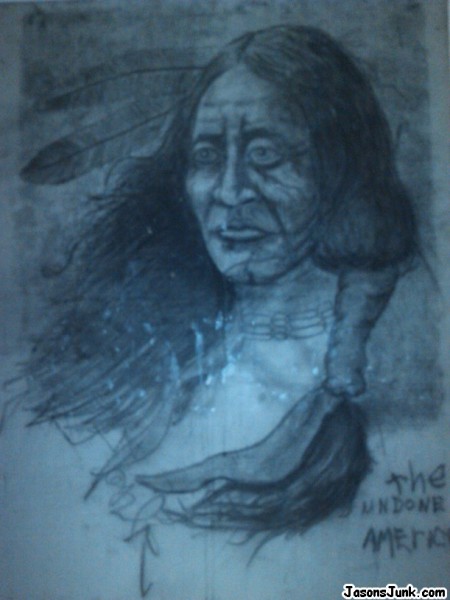 This was bought at a yard sale about 20 years ago for $10. It only says the undone American and signed by someone but I don't know what it says. the size is 2.5 ft by 3.25 ft.I am curious on who drew it. Maybe what its worth. Any information would be great.
