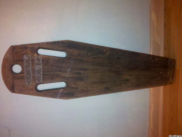 Wooden, pine I think, 34.5 inches long. Tapered slots and hole. Metal tags state: Central and Rog. 24.
