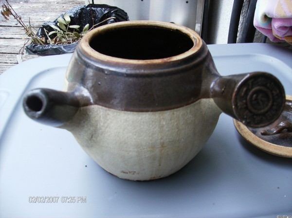 6" high, 7" wide.fired on inside and outside, brown glaze, bottom has stove marks like it was heated up, can't read markings on the "handle?". Don't know what this is, maybe a fogger or steamer.