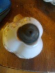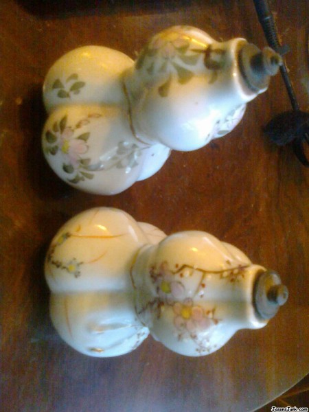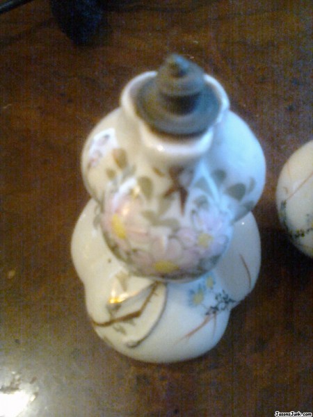Porcelain painted powder holders, approximately 4 1/2 inches high with bronze/metal screw tops. The opening for the powder to be dispensed is approximately 1/16th to 1/8th inch in diameter. they have been in the family for 50 - 60 years or longer.