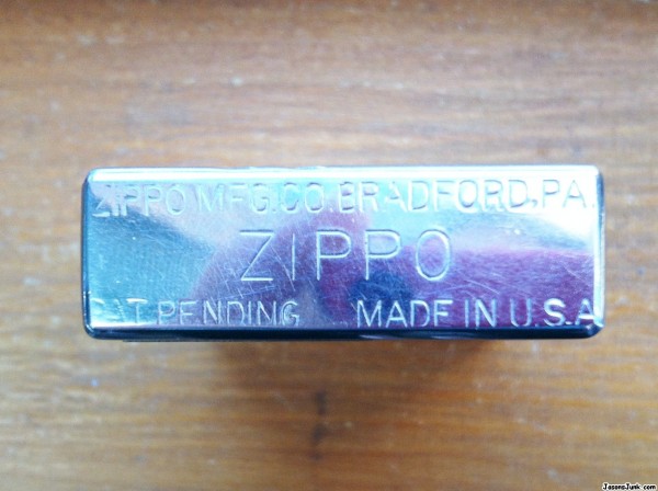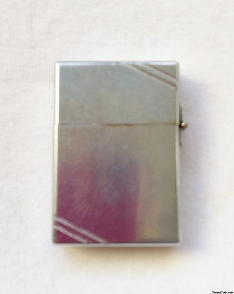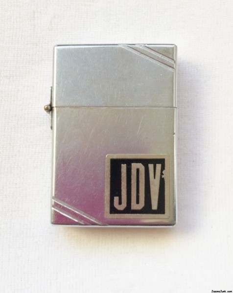 I know this is a pre-1937 model because of the "Pat Pending" printed on the bottom of it. It measure 2 and 2/16" tall, 1.5" wide, and .5" deep. It is silver in color. Don't know if it's chrome, steel or some other metal. It has two diagonal grooves on both the top and bottom of both sides. It is a flip-top with a hinge. It has a monogram on it, the letters "JDV," both the border and the letters are gold and the background is black. The monogrammed area is .66" square. It appears to be in good condition, with a few scratches on it, but not deep srcatches. There is an unused wick inside the lighting mechanism, but it does appear to have been used because there is minor sooting on the inside of the lid